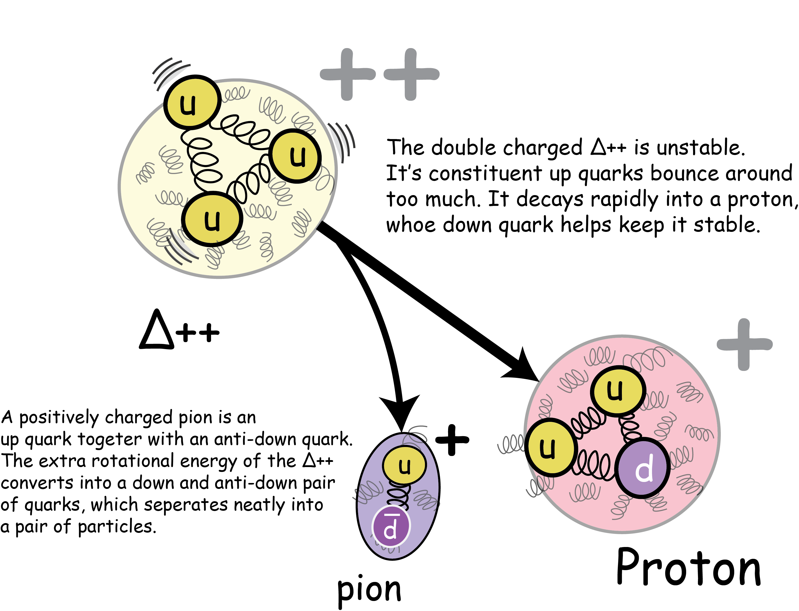 Δ+ typically decays to a proton and neutral pion:Δ+ → p++π0.