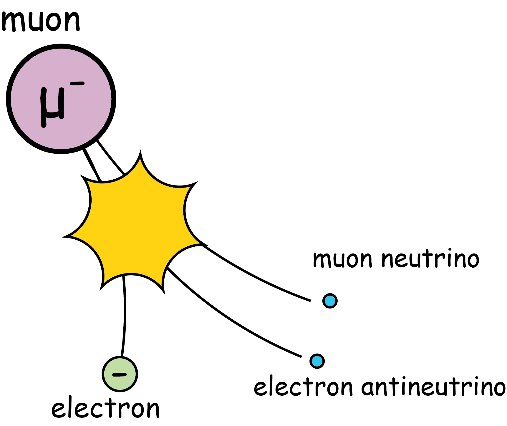 Schematically, the muon transforms into that W boson and a muon neutrino. The W boson itself then transforms into the electron and an anti-electron neutrino.