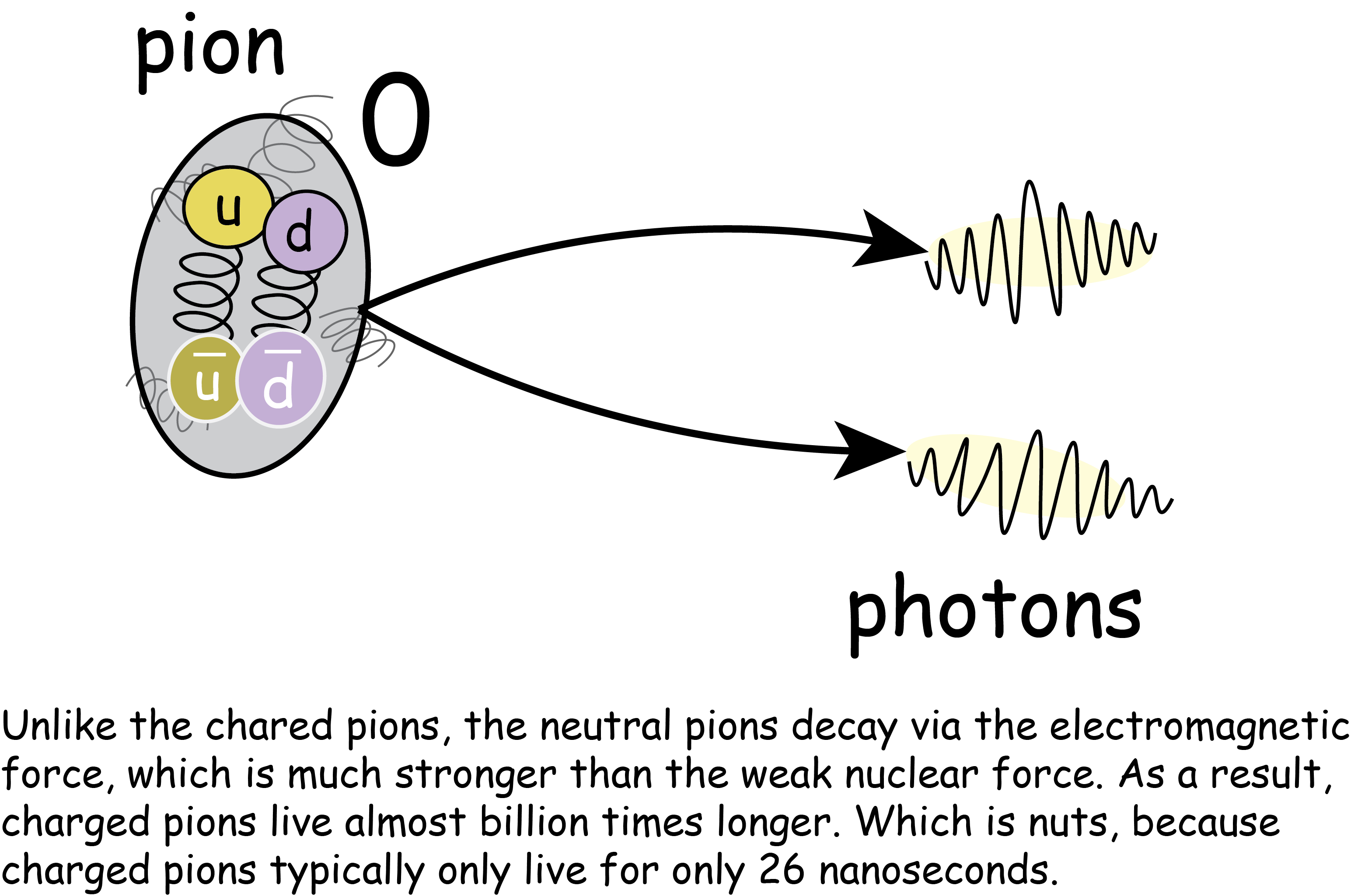 π0 mesons decay much, much faster than their charged siblings, a literal billion times faster. They only stick around for about 8.5×10−17 s. Yikes! That’s so small it probably doesn’t mean anything to most of us! By particle standards, it’s a properly fast decay.
