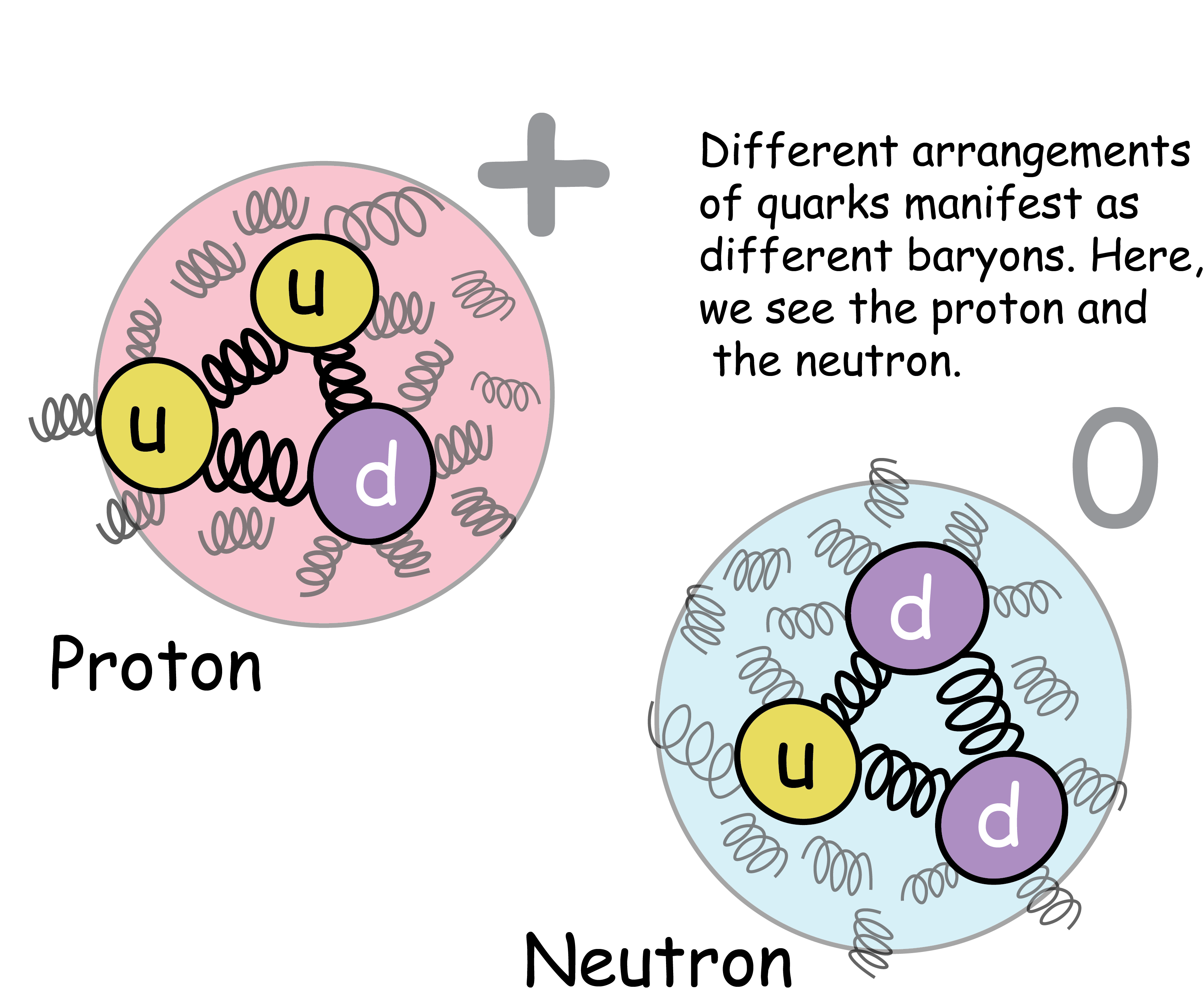 There are all kinds of quarks, but the two most relevant for everyday life are the up and the down quarks. The proton has two up quarks and one down quark. The neutron has two down quarks and and up quark. Don’t read too much into those names.